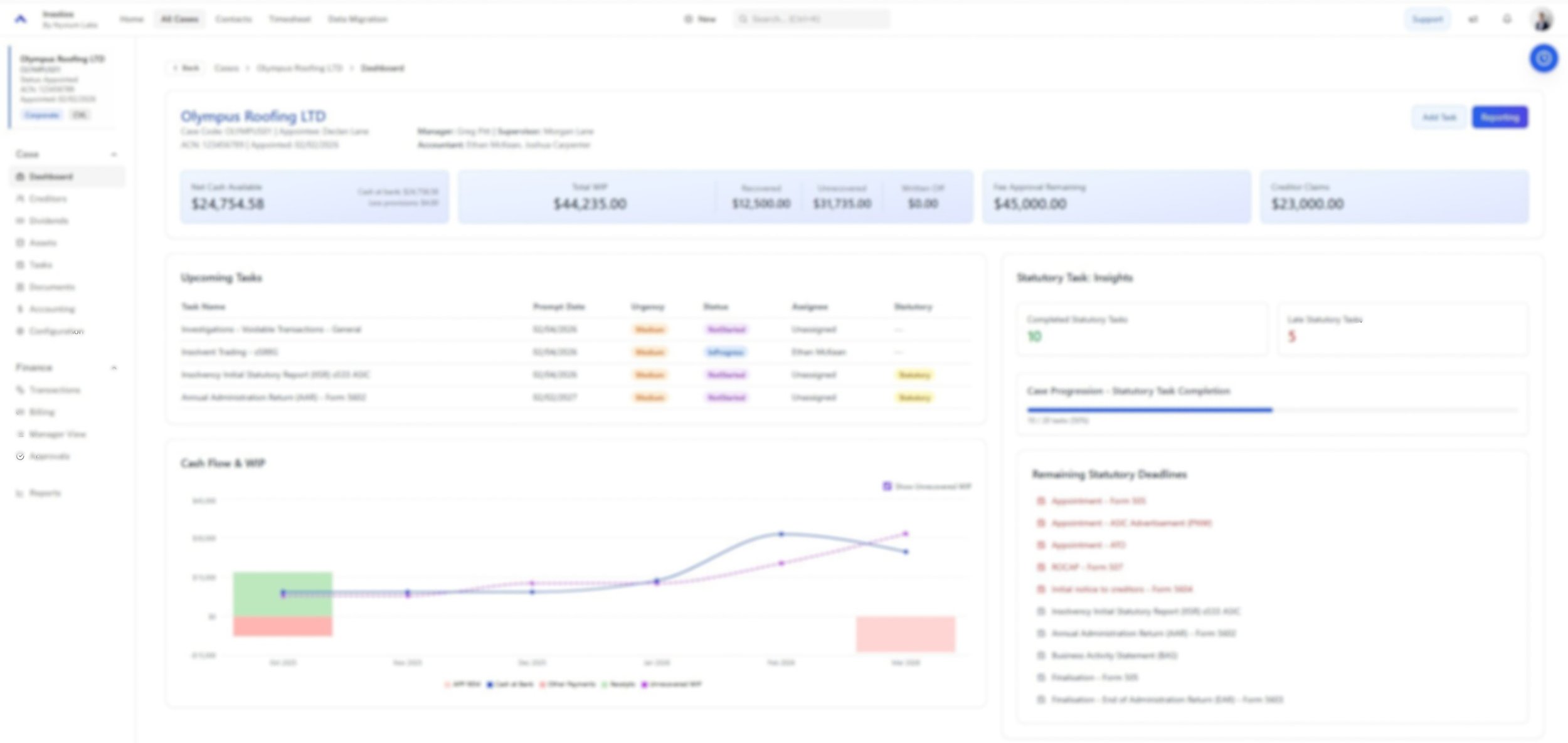 SaaS solutions for businesses Insolios - Practice Management Software, specialising in Restructuring, Insolvency & Advisory Book Demo Discover our features View fullsize